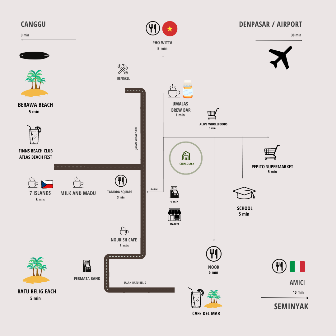 to Canggu. It takes only 3 minutes by your scooter to get there.